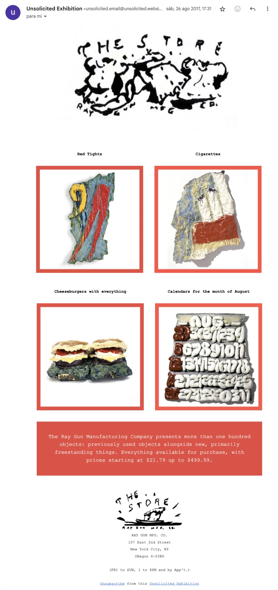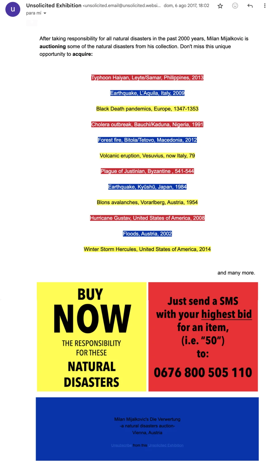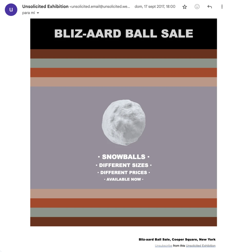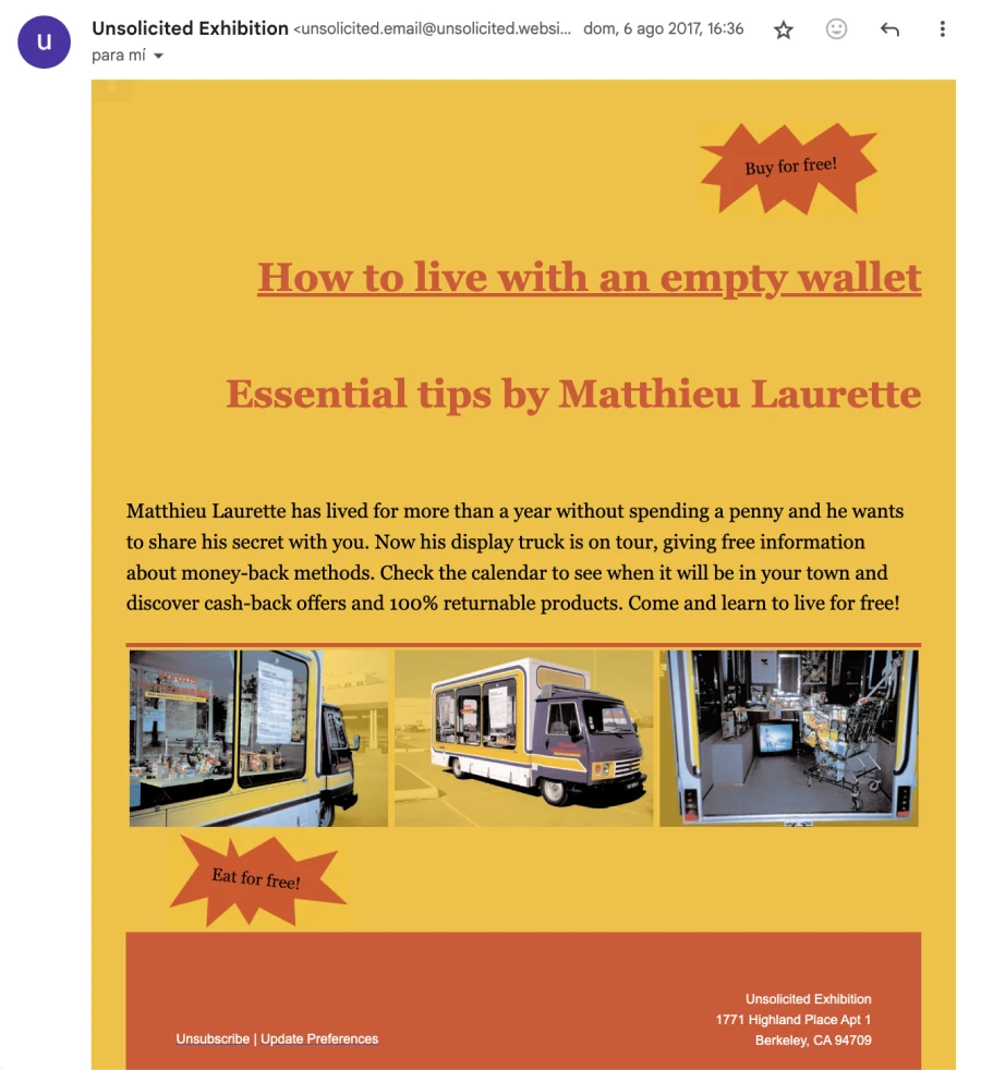 Unsolicited exhibition was an exhibition through e-mail that showcased advertisement messages from artists’ businesses to recipients that had not granted verifiable permission for this to occur. All artworks/businesses displayed at Unsolicited exhibition explicitly labeled their audiences as potential consumers, used corporate culture mechanisms and were involved in the provision of goods and services. From conventional restaurants to speculative companies, from traditional yard sales to futuristic enterprises, all the projects appeared in the inbox of more than 1000 unaware visitors from July 16 – October 29, 2017.