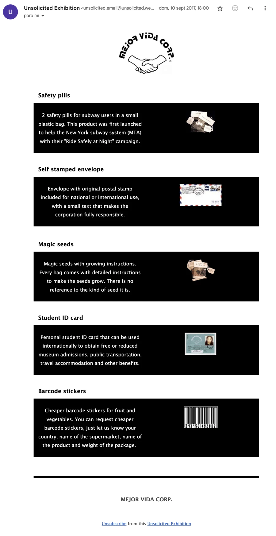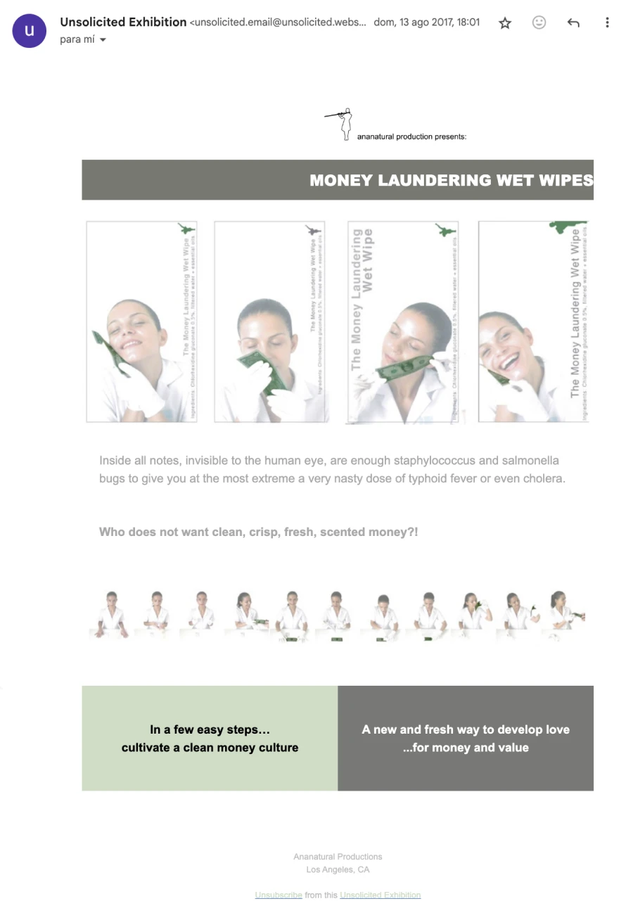 Unsolicited exhibition (Exposición no solicitada) fue una exposición a través del correo electrónico que presentaba mensajes publicitarios de empresas producidas por artistas visuales. Estos anuncios se enviaban por e-mail a destinatarixs que no lo habían solicitado, de ahí el título de la exposición. Todas las obras de arte/empresas expuestas en Unsolicited exhibition se dedicaban a la provisión de bienes y servicios, utilizaban lenguajes corporativos e identificaban explícitamente a sus destinatarixs como potenciales consumidorxs. Los proyectos incluidos en esta exposición, que iban desde restaurantes convencionales a empresas especulativas, desde mercadillos tradicionales a empresas futuristas, se enviaron a la bandeja de entrada de más de 1000 personas entre el 16 de julio y el 29 de octubre de 2017.